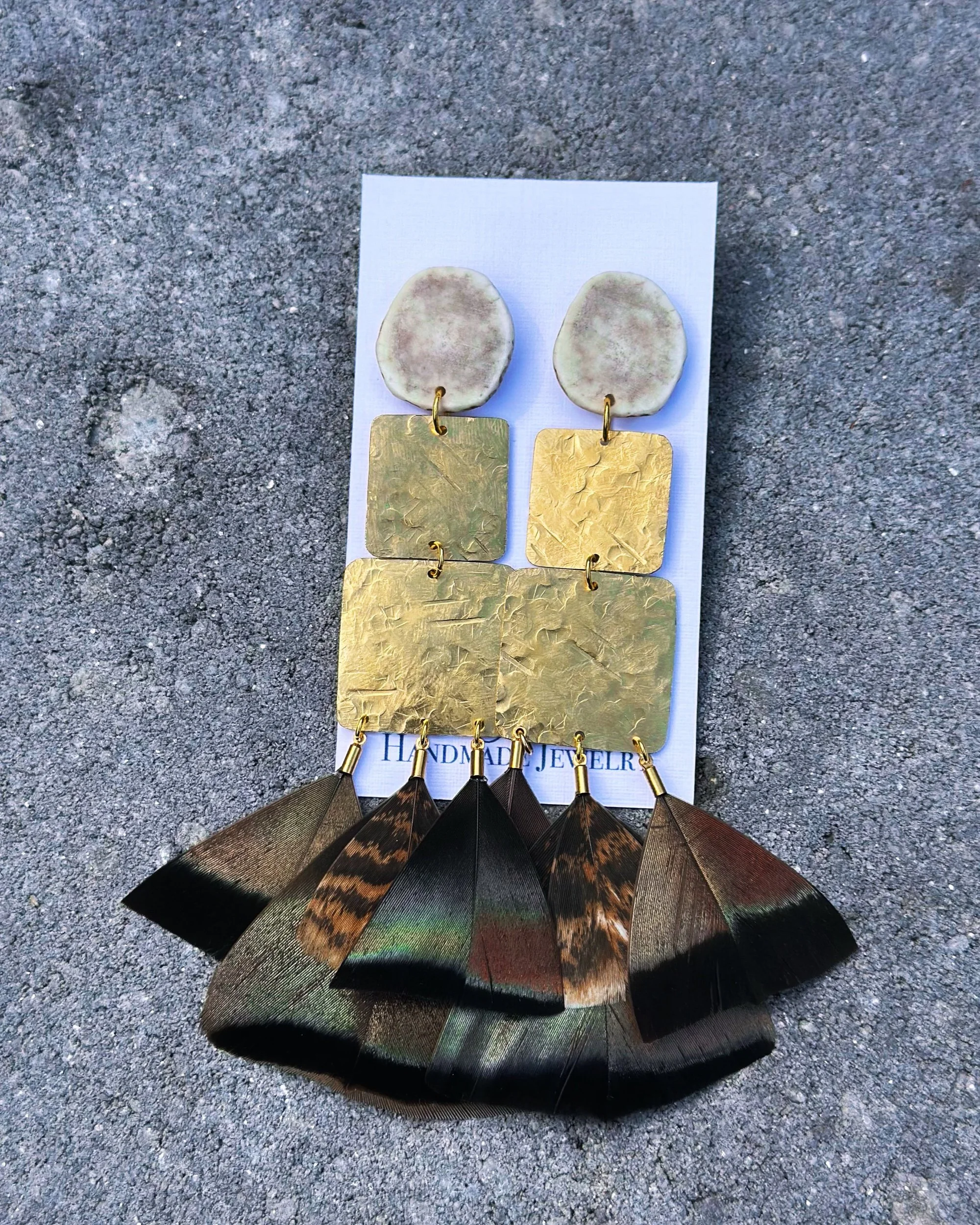 This pair has all the drama! Large deer antler studs with hand cut brass drops, and a variety of 3 turkey feathers on each one.